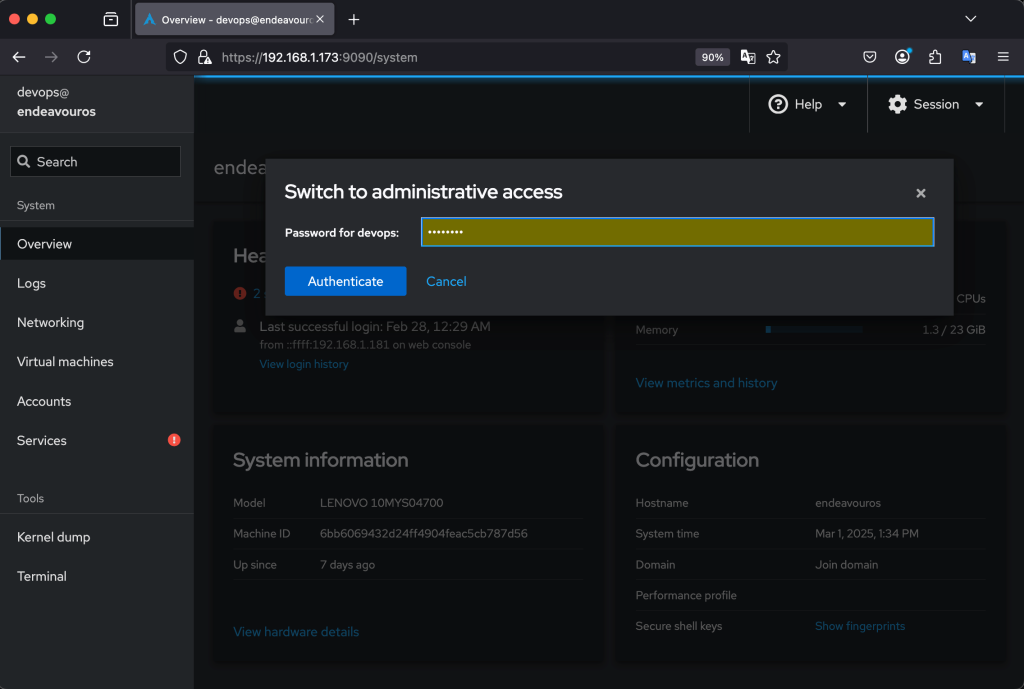 To create a virtual machine in Cockpit, first enable full access mode by clicking on the blue Turn on administrative access button, and enter your password if needed.