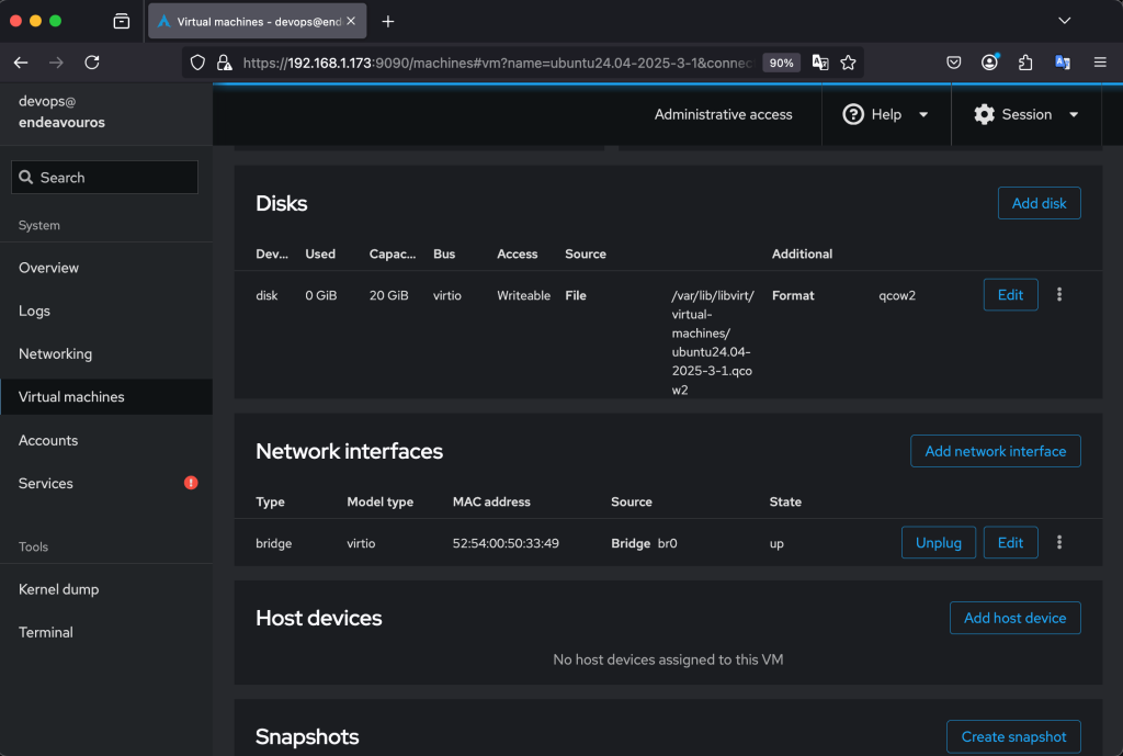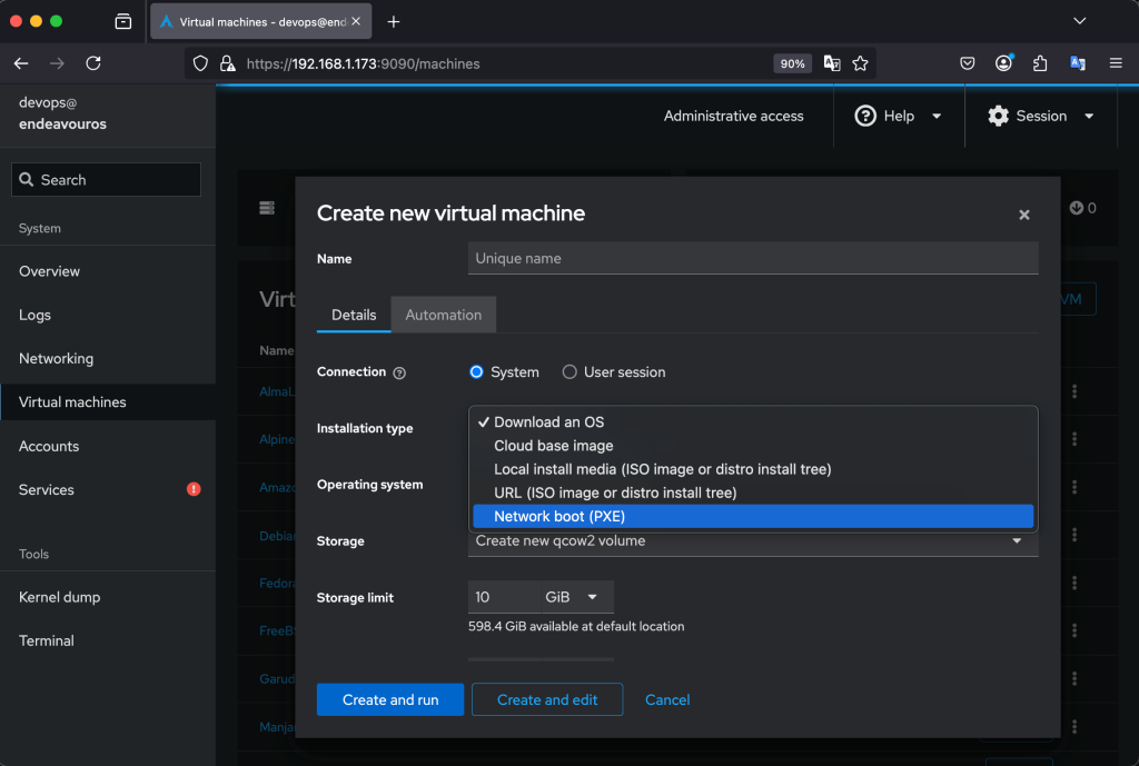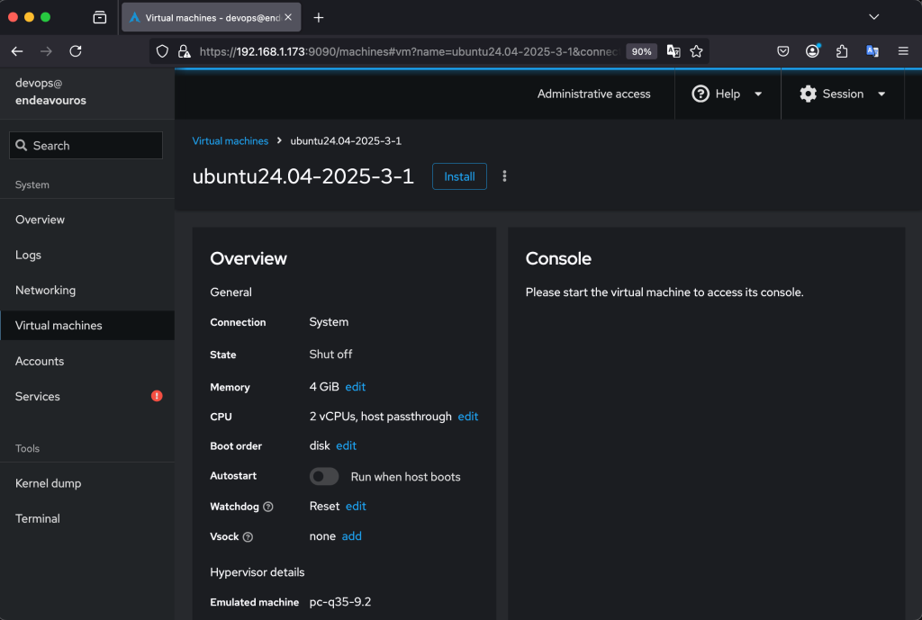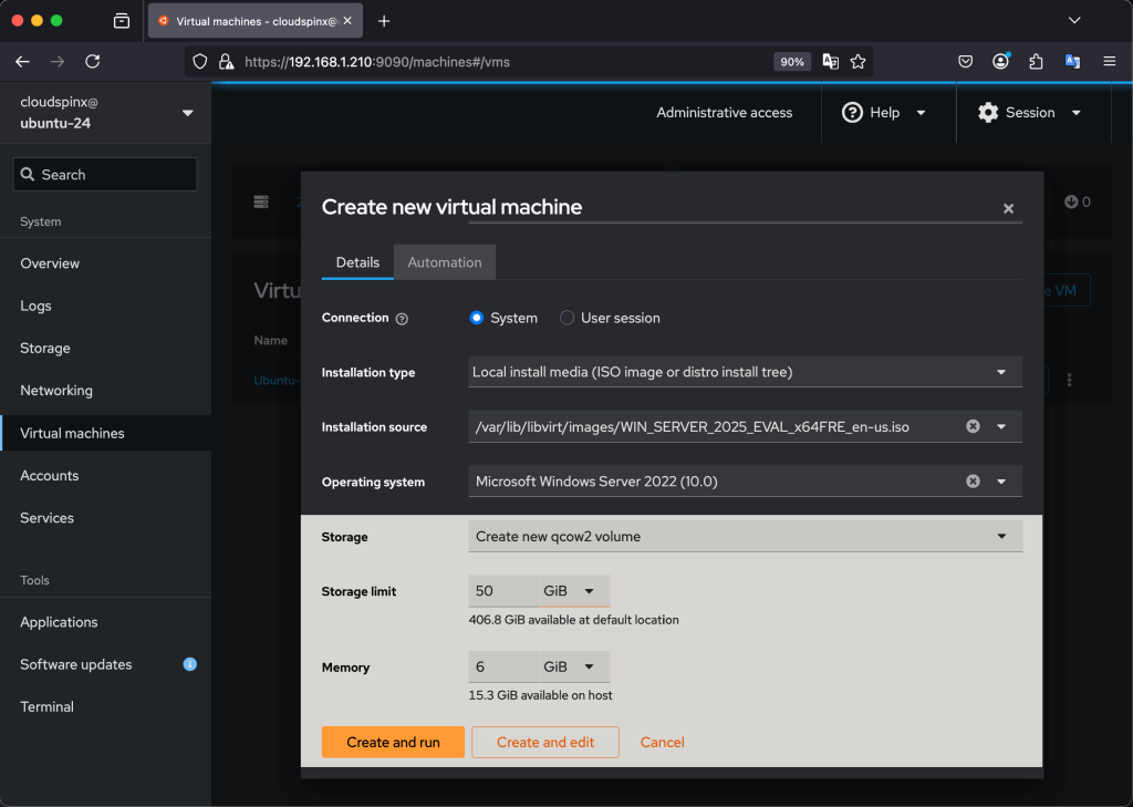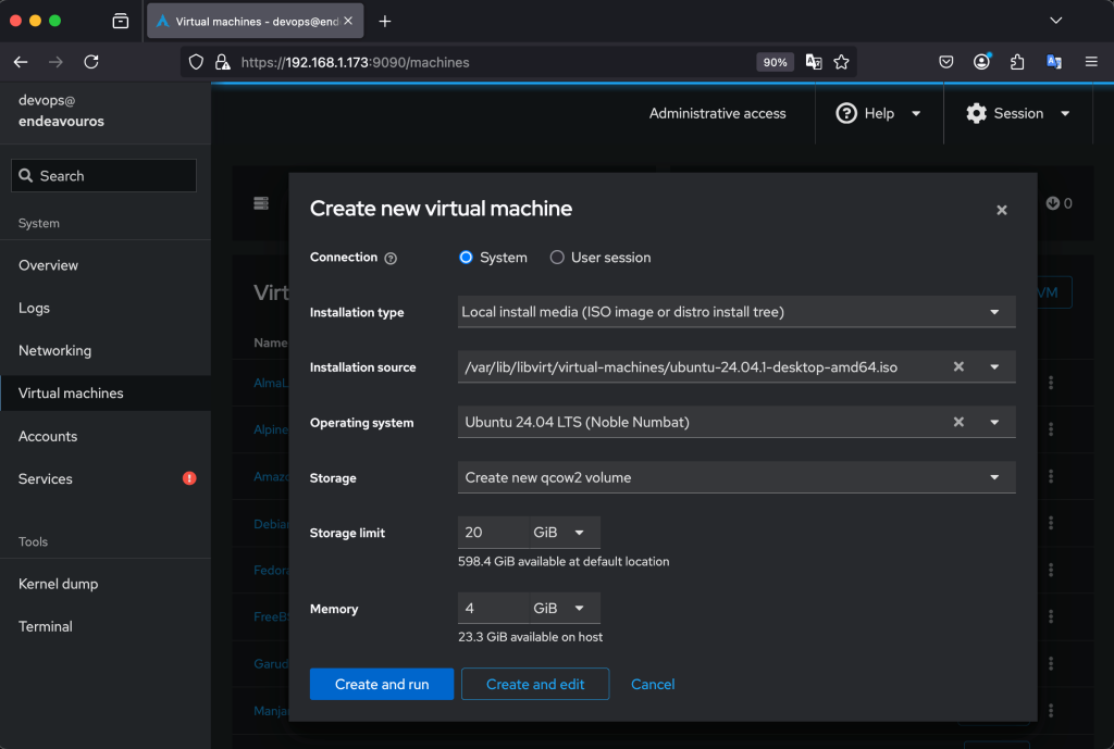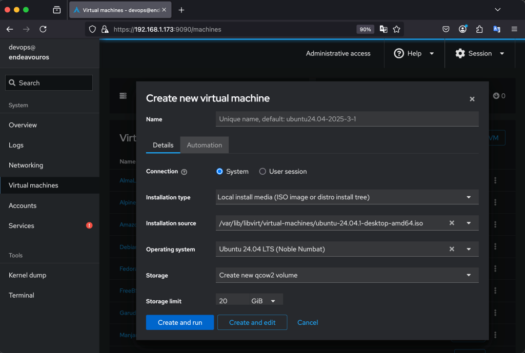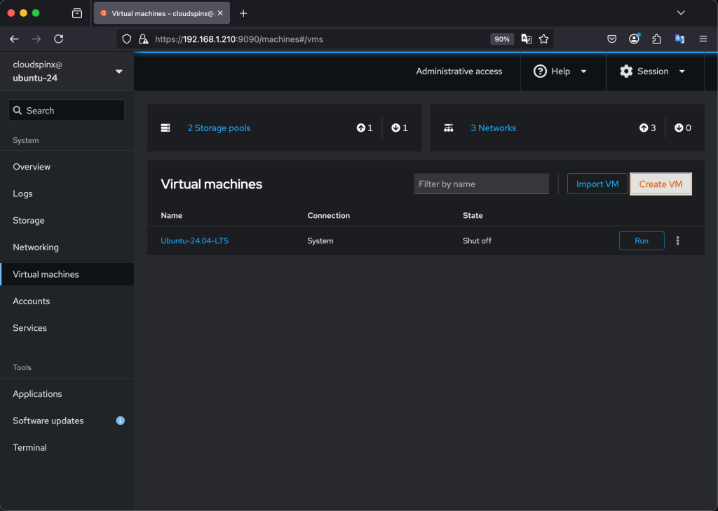 Cockpit provides a web-based interface for managing KVM virtual machines, offering an intuitive way to create, configure, and monitor VMs without relying on complex command-line operations. Through its Virtual Machines module, users can easily deploy new VMs, assign resources, and install operating systems with just a few clicks.