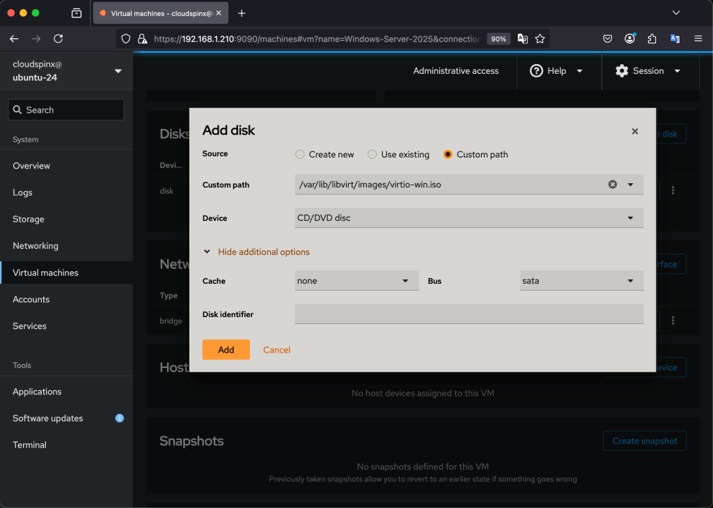 Add the virtio-win iso file by clicking on Add disk. For the source select Custom Path, then provide the absolute path to the virtio-win.iso file.