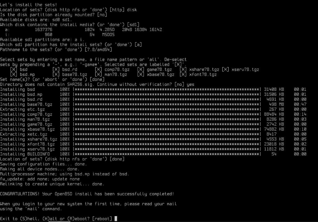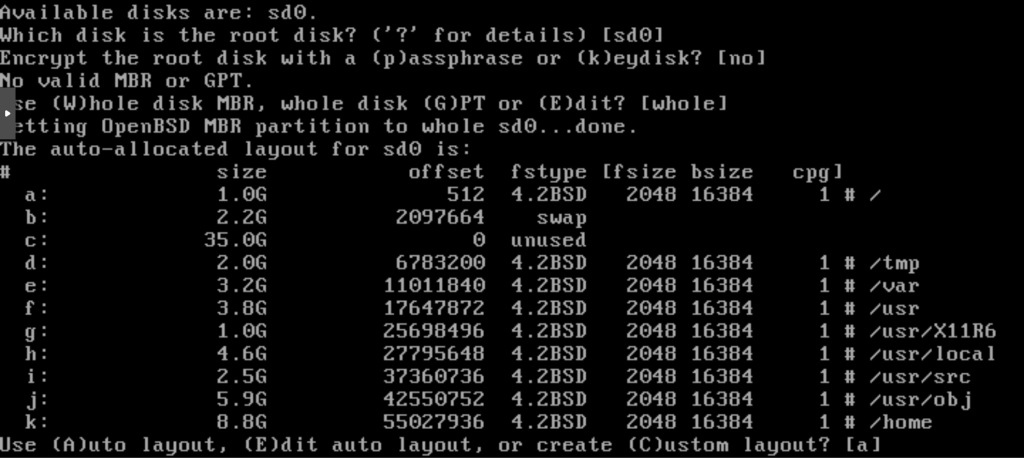We start by defining the destination disk for the installation sd0, if you’re not sure which disk to select you can list them with ‘?’, then the disk partitioning method (MBR). Finally, select the automatic partitioning proposal [a].
