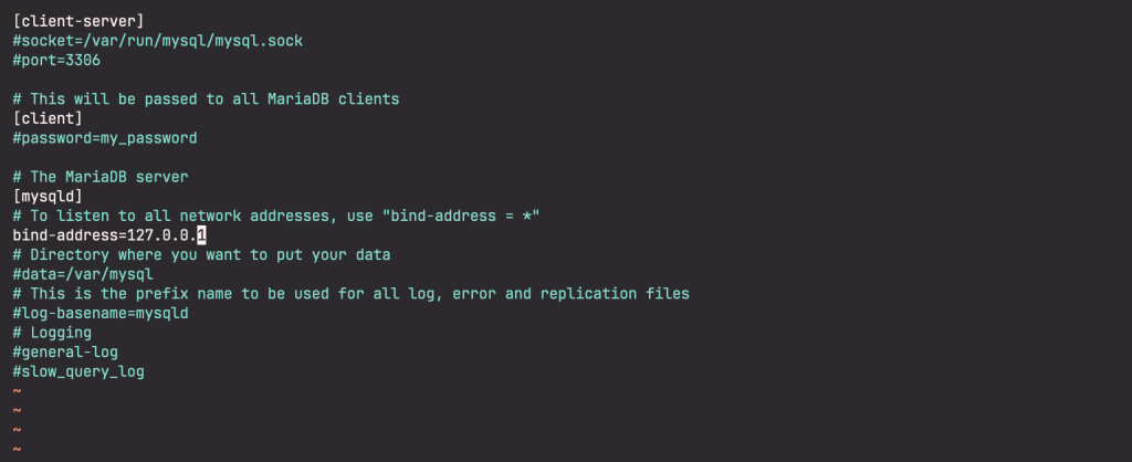 If you get an error in checking the status, please configure the file /etc/my.cnf to look like this. This is the default file where all necessary parameters are configured. For example, you can enable the default port 3306 by removing the # symbol as shown in the screenshot.