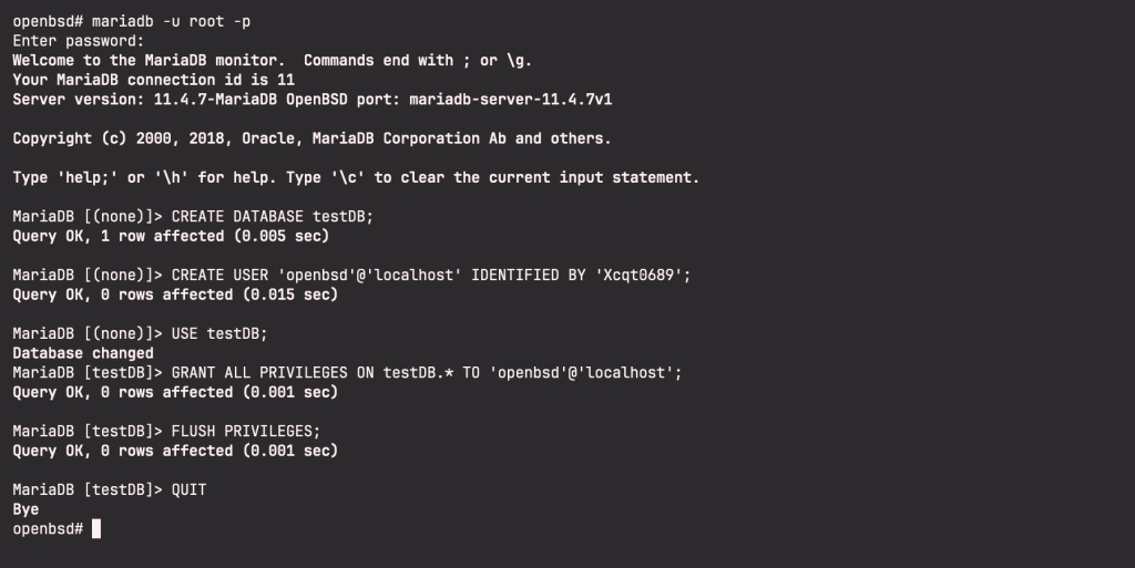 MariaDB [testDB]> GRANT ALL PRIVILEGES ON testDB.* TO 'openbsd'@'localhost';