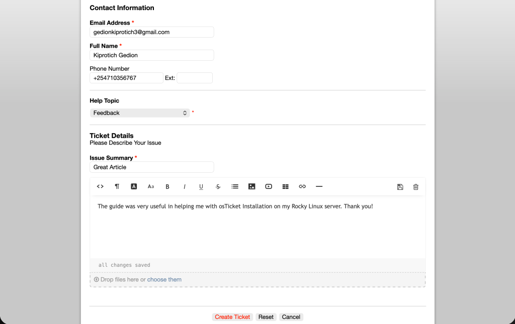That marks the end of our guide on how to install and configure osTicket on Rocky Linux 9 | AlmaLinux 9. Now you are set to start organizing, managing and archiving support requests. I hope you found this guide helpful.