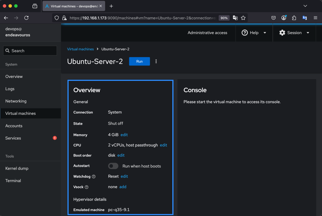 To start, stop, or reboot a VM, navigate to the Virtual Machines section and select the VM you want to control. Then click Run, Shut Down, or Reboot as needed.