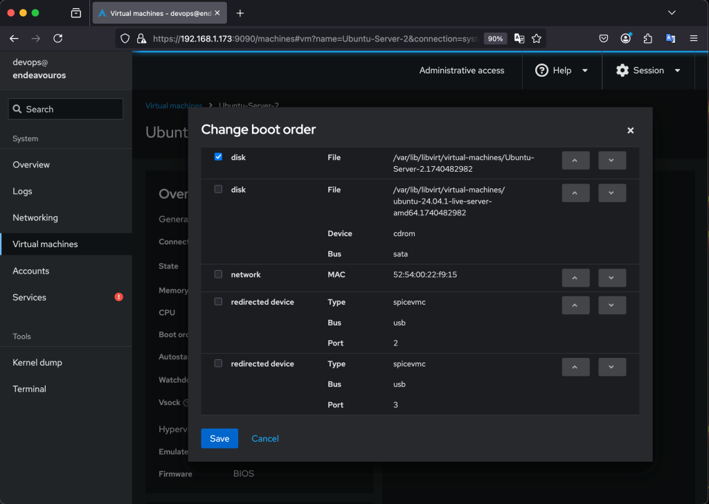 To edit a VM’s boot order, locate the edit button corresponding to Boot order on the VM Overview page: