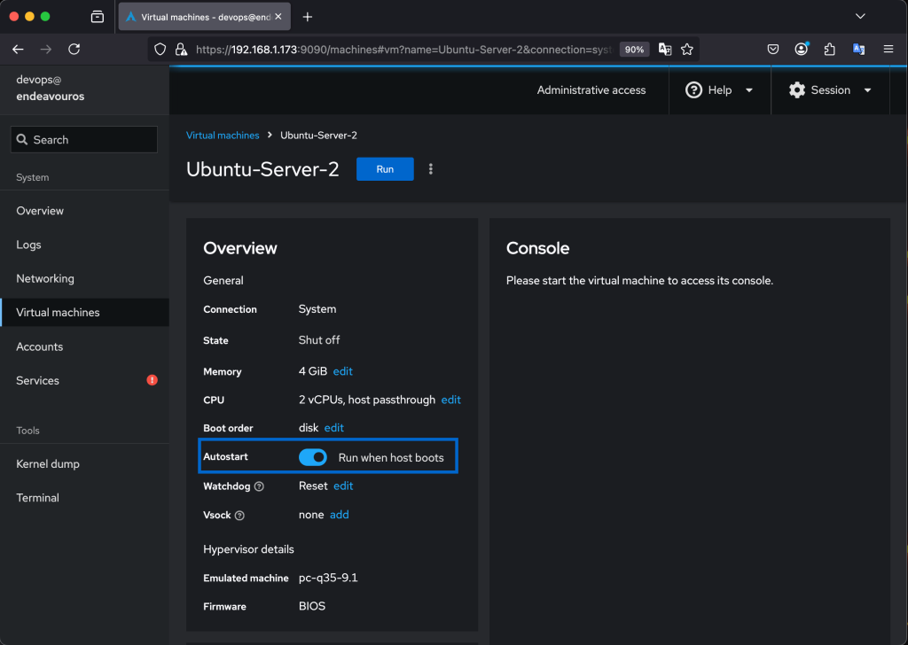 In cockpit, you can configure your virtual machine to run whenever the host boots. Click on the autostart switch just below Boot order: