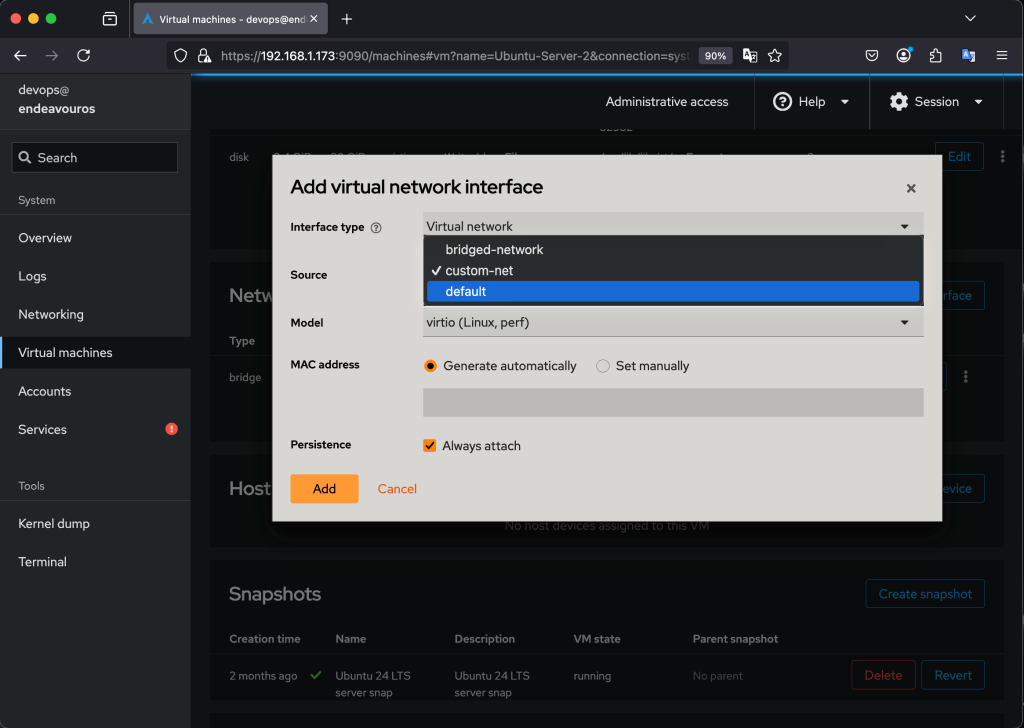 • Virtual network: This option attaches the virtual machine’s network interface to a libvirt-defined network, allowing for isolated or internal networking.
