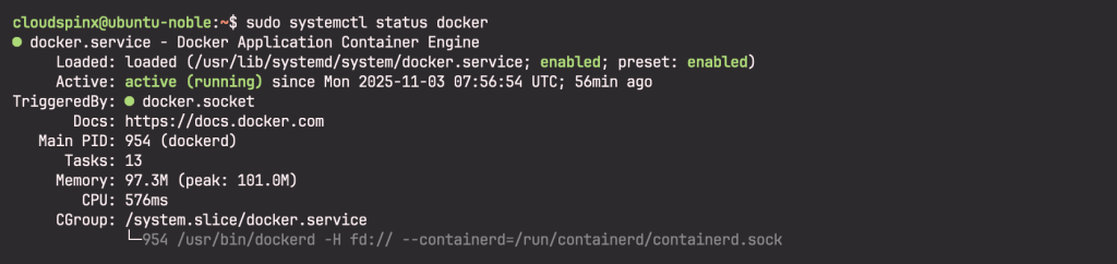This configures the Docker systemd service to start automatically when you boot your system. If you don’t want Docker to start automatically, useĀ sudo systemctl start dockerĀ instead.