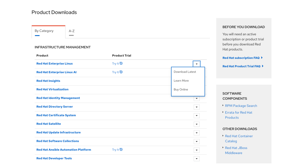 Go to the Red Hat Product Downloads page and click on the dropdown menu: